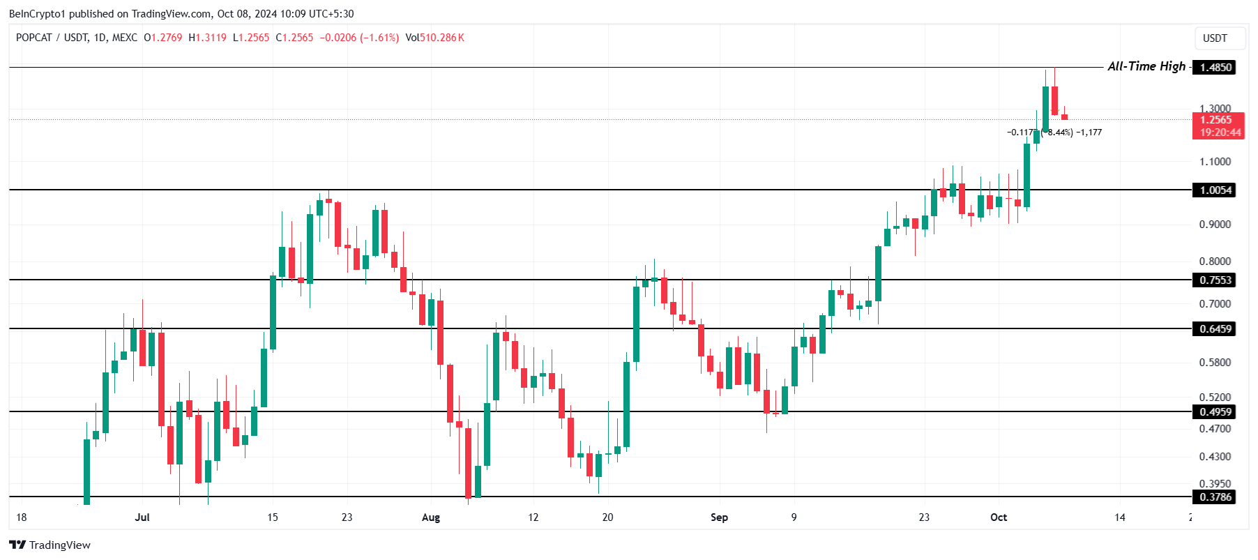 O próximo suporte crítico para o preço está em US$ 1. Uma queda para esse nível é possível se a tendência de baixa continuar. No entanto, se o mercado mais amplo de criptomoedas mudar para uma perspectiva otimista, a POPCAT pode retomar sua trajetória ascendente, potencialmente superando máximas anteriores e estabelecendo novos recordes históricos.
