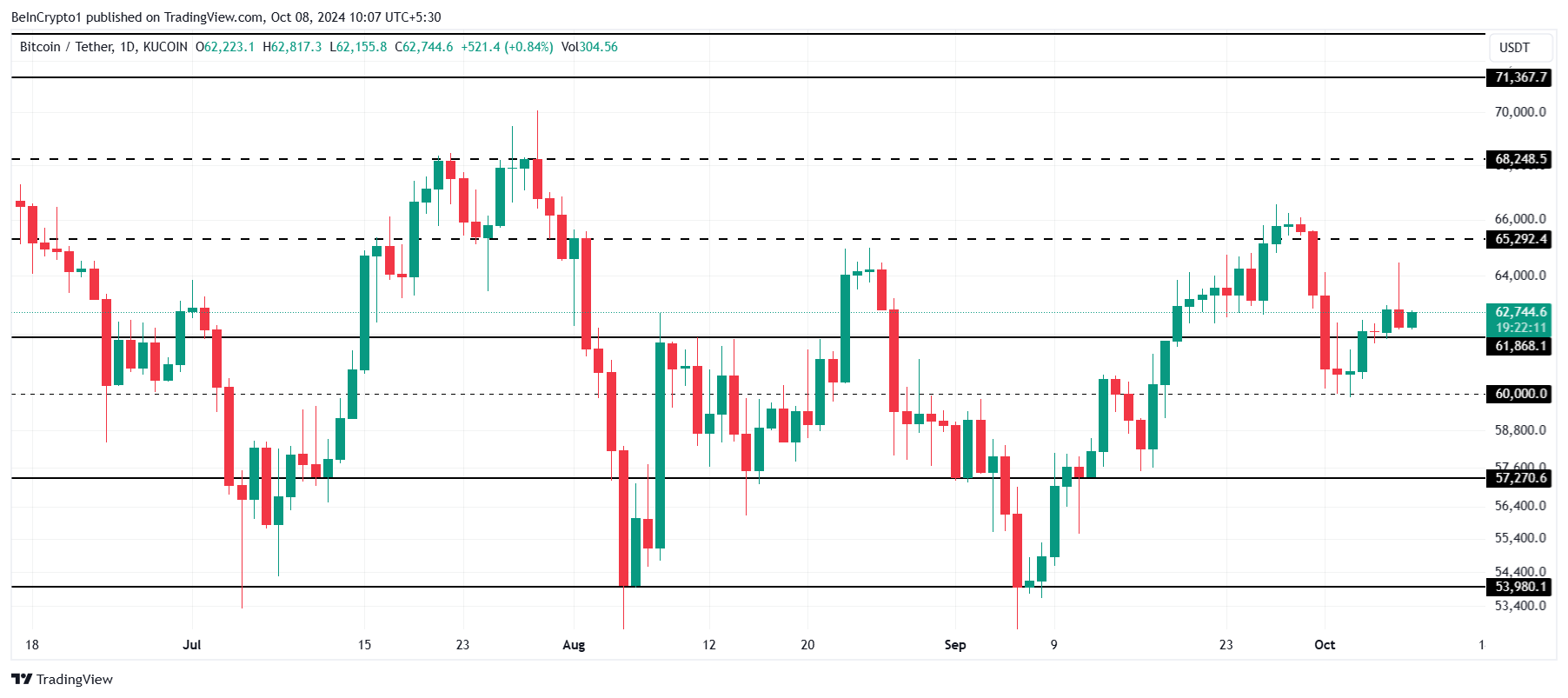 O Bitcoin continua resiliente, mantendo-se acima do nível de suporte crucial de US$ 61.868 esta semana. A criptomoeda tentou ultrapassar a marca de US$ 65 mil durante a máxima intradiária, mas não conseguiu sustentar o movimento de alta. Apesar disso, continua a mostrar força à medida que se consolida acima do suporte.