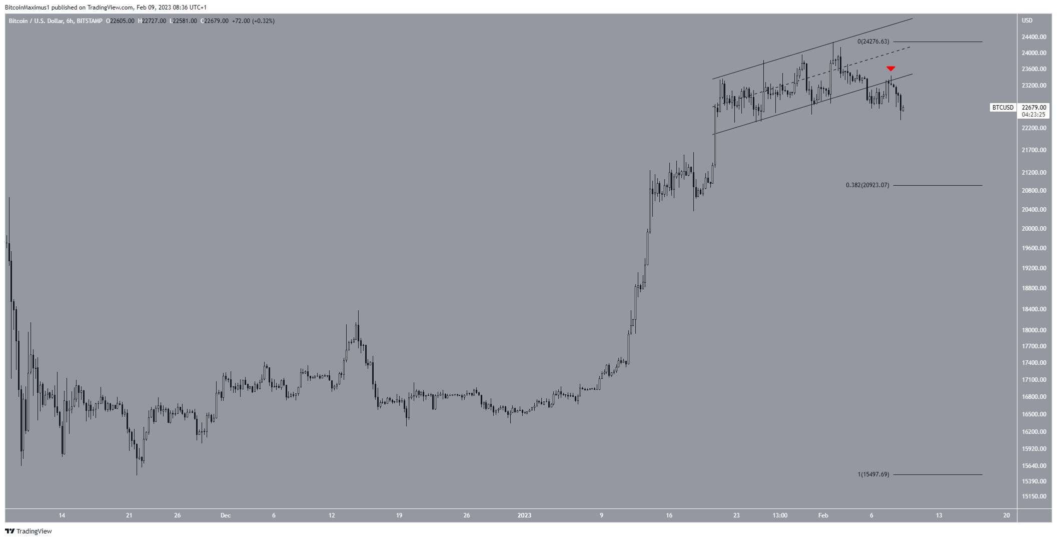 O BTC está negociado em um canal paralelo de alta desde 23 de janeiro. Após a queda de sua linha de resistência em 2 de fevereiro, o preço caiu abaixo desse padrão gráfico quatro dias depois.