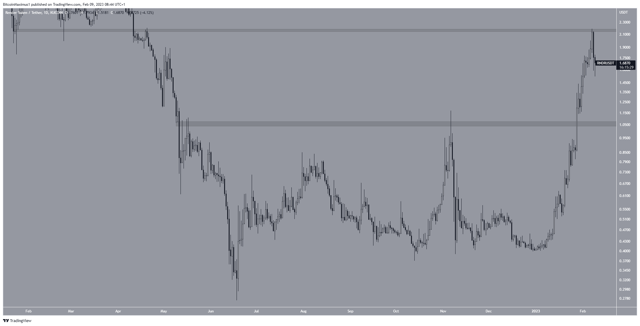 O preço do Render Token tem subido desde que saiu da área de resistência de US$ 1,05 em 28 de janeiro. O movimento levou a um topo de US$ 2,19 feito na última terça-feira (7).