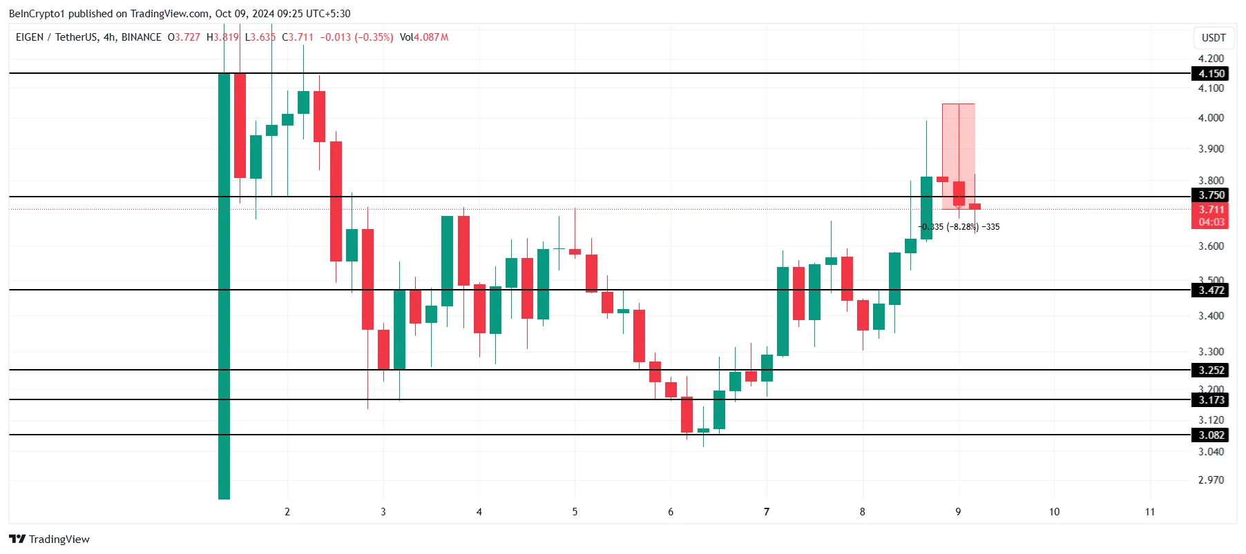O EIGEN ainda tem potencial para se recuperar se conseguir transformar a resistência de US$ 3,75 em suporte. Conseguir isso permitiria que a altcoin se recuperasse em direção ao seu próximo nível de resistência em US$ 4,15, reacendendo o otimismo dos investidores e mantendo a tendência de alta.