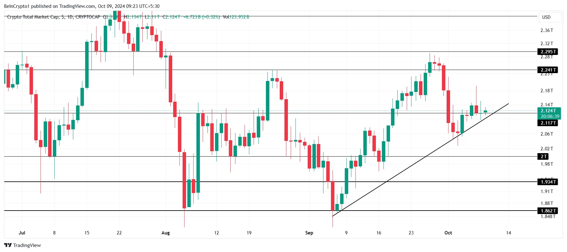 Com uma linha de tendência de alta de um mês atuando como um suporte-chave, o valor total do mercado de criptomoedas pode ver um salto, potencialmente empurrando-o para a próxima meta de US$ 2,24 trilhões. Isso sinalizaria crescimento contínuo e otimismo dentro do mercado.