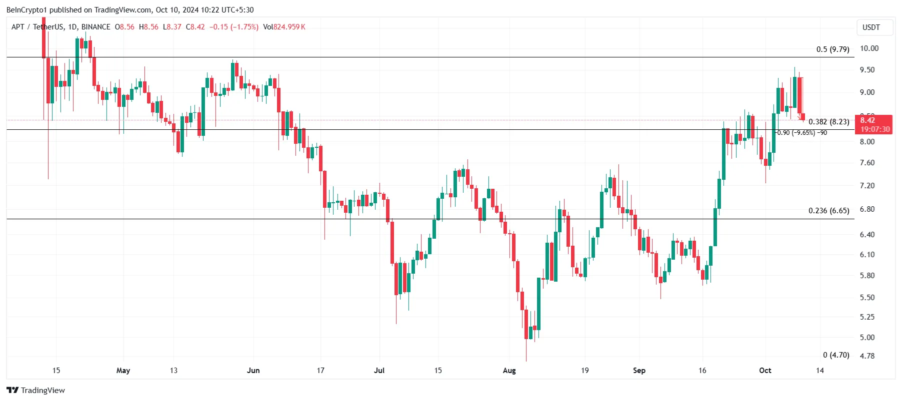 O Aptos sofreu um declínio de 9% em 24 horas, negociado atualmente a US$ 8,42. Apesar da queda, permanece acima da linha de retração de 0,382 de Fibonacci, oferecendo esperança para uma recuperação potencial. Os investidores estão observando de perto para ver se esse nível se mantém.