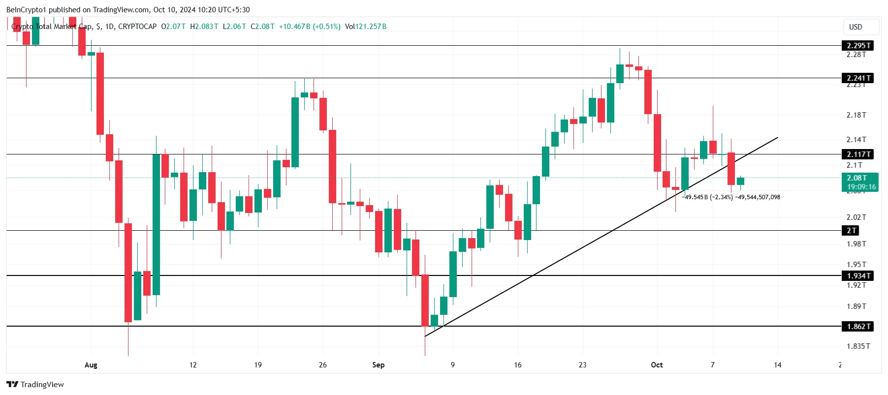 O valor total do mercado de criptomoedas registrou um declínio de US$ 47 bilhões em 24 horas, já que o TOTALCAP perdeu o suporte de US$ 2,11 trilhões. Ao fazer isso, o preço também caiu na linha de tendência de alta.