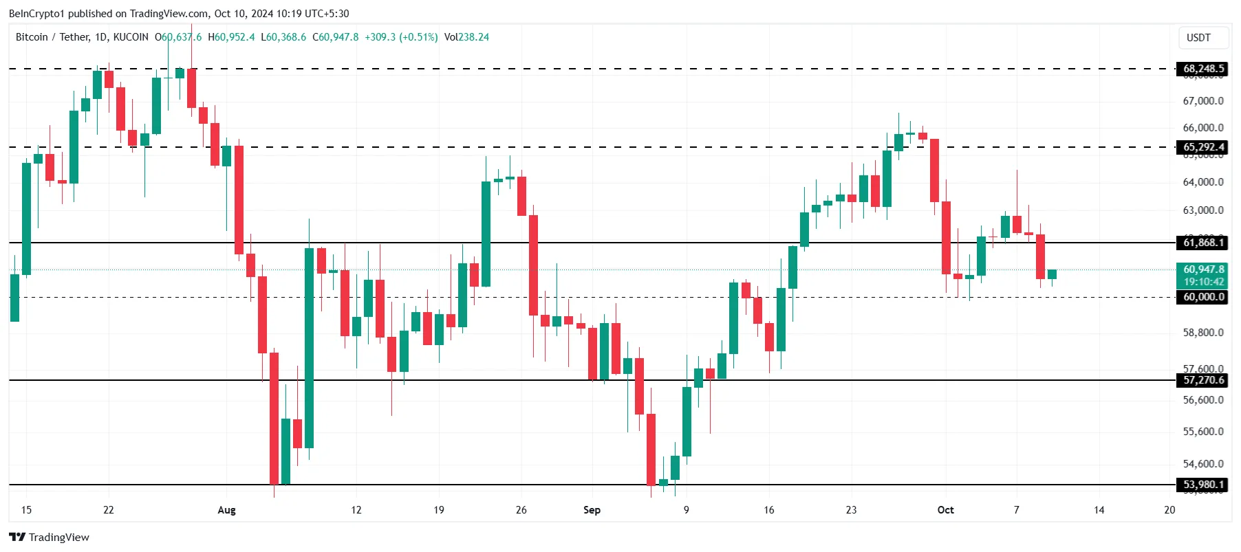 O Bitcoin seguiu tendências de mercado mais amplas, negociado atualmente a US$ 60.947. Apesar do declínio, o ativo está mantendo uma posição forte acima do nível de suporte crucial de US$ 60 mil. Este suporte-chave até agora evitou mais perdas e é crítico para a perspectiva de preço de curto prazo.