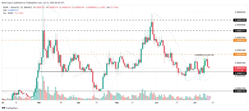 Negociando a US$ 0,00002304, a memecoin ainda mantém US$ 0,00002153 como nível de suporte, tentando romper a resistência em US$ 0,00002840.