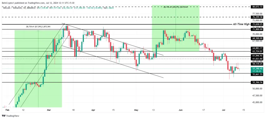 No entanto, se a recuperação não começar em breve, os investidores impacientes poderão passar a vender, resultando numa descida do preço para US$ 55.661 ou inferior para US$ 52.000.