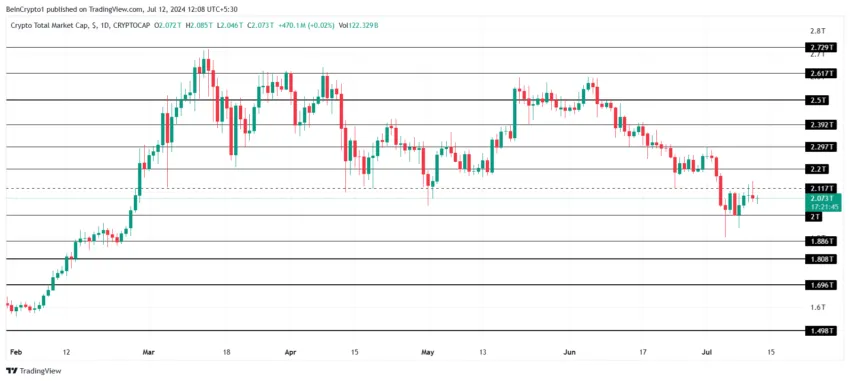 A falta de volatilidade no mercado está fazendo com que a capitalização total fique em torno de US$ 2,02 trilhões. O TOTALCAP ainda está abaixo da marca de US$ 2,11 trilhões, o que é crucial para iniciar a recuperação.