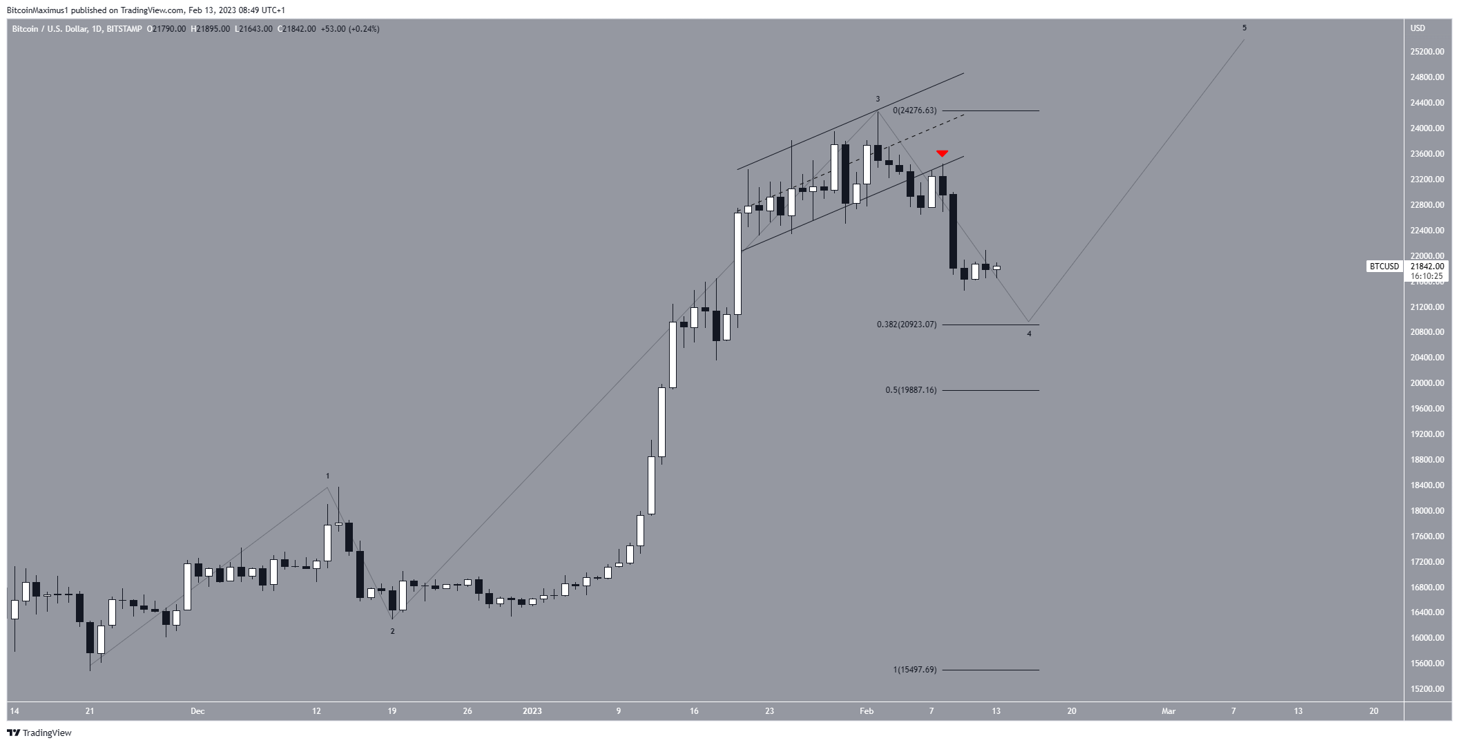 O nível mais provável para a correção terminar seria em US$ 20.920, que é o nível de retração de 0,382 de Fibonacci. Posteriormente, o salto pode continuar em direção a US$ 25.300. Uma queda abaixo da área de US$ 20.920 pode levar o preço do BTC para o próximo suporte em US$ 19.890.