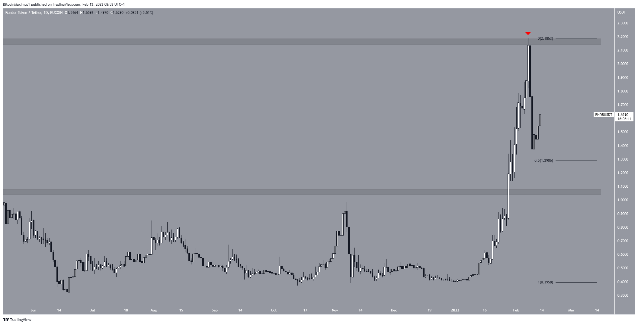 O preço do RNDR caiu desde que foi rejeitado pela área de resistência de US$ 2,15 em 7 de fevereiro (ícone vermelho). A queda levou a uma mínima de US$ 1,27 no dia seguinte. O preço RNDR então saltou no nível de retração de 0,5 de Fibonacci e vem subindo desde então.