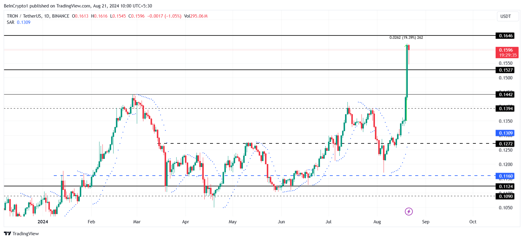 Espera-se que o preço da Tron se estabilize em torno do nível de suporte de US$ 0,1527, que foi testado no passado. Manter esse suporte pode ajudar a TRX a continuar sua tendência de alta e evitar que perca seus ganhos recentes.