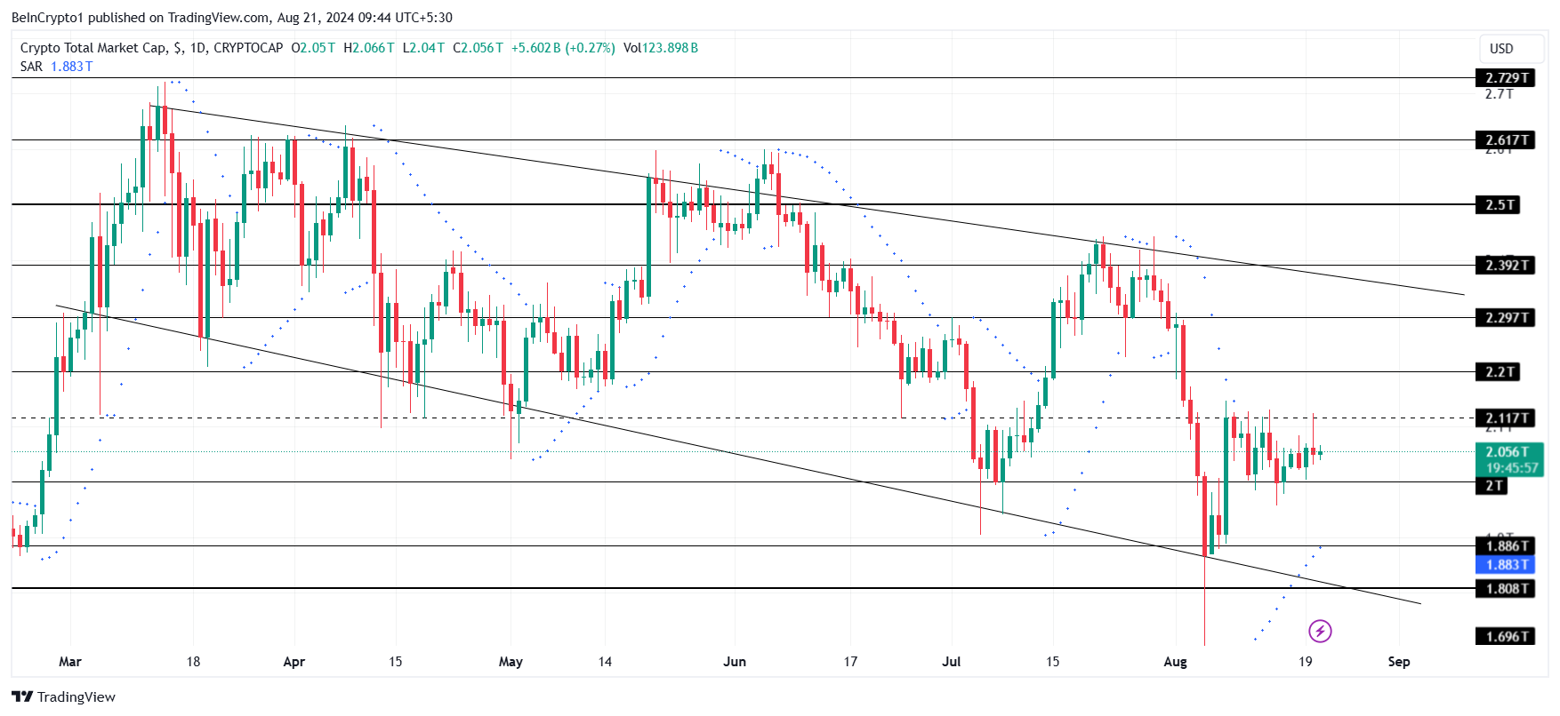O valor total do mercado de criptomoedas quase ultrapassou US$ 2,11 trilhões após adicionar US$ 53 bilhões durante o aumento intradiário, o nível crítico de resistência atual. No entanto, isso não persistiu e o preço caiu abaixo dessa resistência.