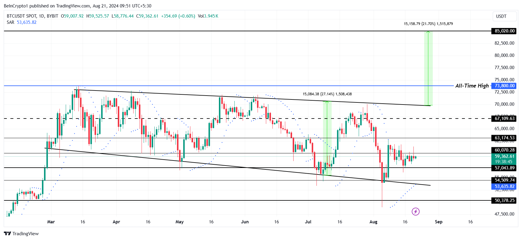 Se o criptoativo continuar a permanecer lateralizado, ele pode se encontrar lutando para ficar acima de US$ 57.000. Atualmente, o BTC está mudando de mãos a US$ 59.360. Se os investidores ficarem impacientes, o preço pode testemunhar um aumento na volatilidade.