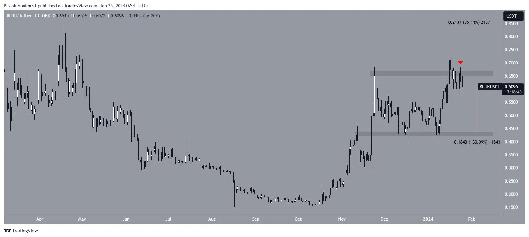 A análise técnica do gráfico diário mostra que o BLUR rompeu a área de resistência horizontal de US$ 0,65 em 16 de janeiro. No entanto, o preço não conseguiu sustentar seu movimento de alta.