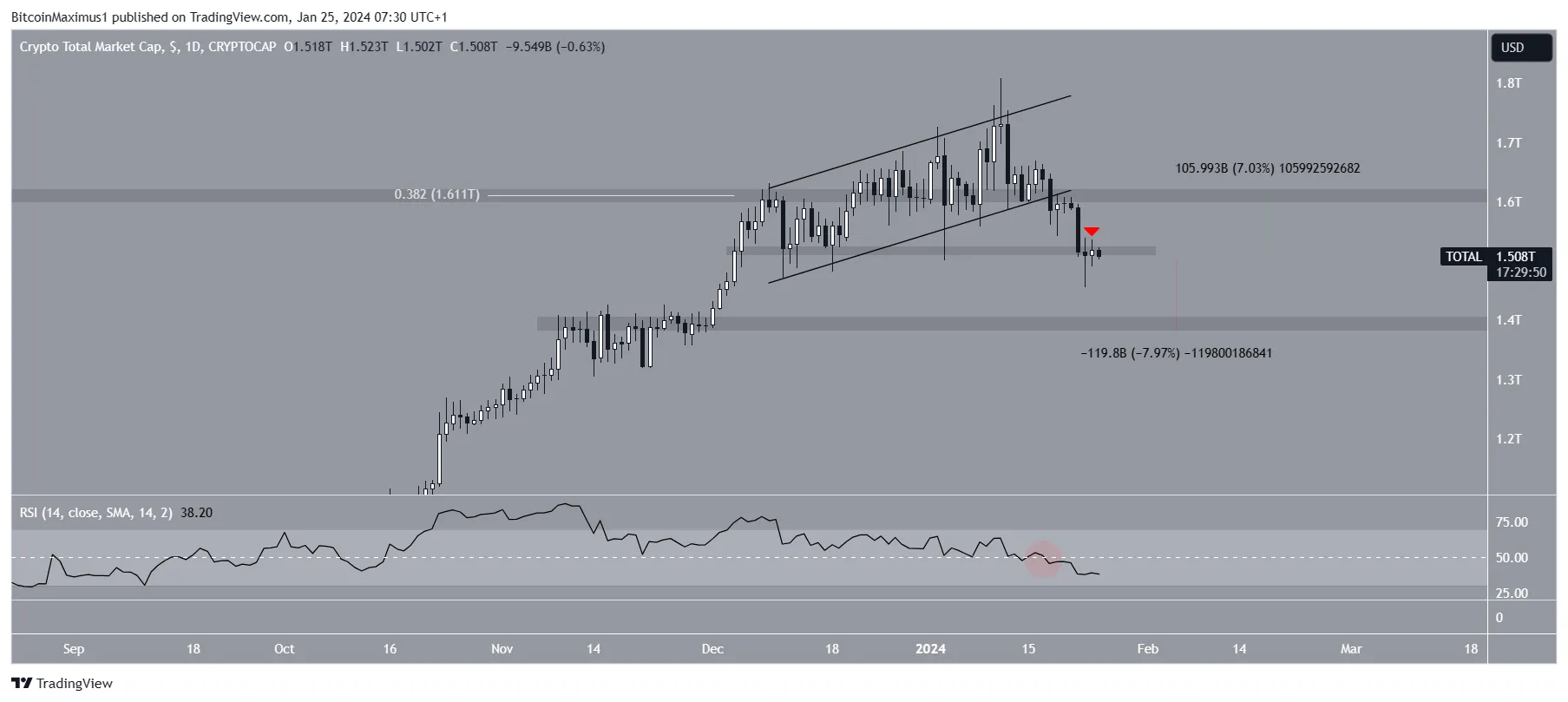 A capitalização total do mercado de criptomoedas foi negociada dentro de um canal paralelo de alta desde 9 de dezembro de 2023. O movimento levou a uma alta de US$ 1,81 trilhão em 11 de janeiro de 2024.