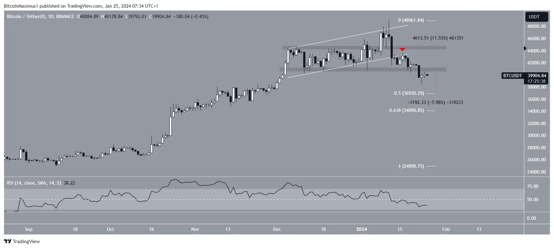 O Bitcoin tem sido negociado dentro de um canal paralelo de alta desde dezembro. No entanto, rompeu o canal em 12 de janeiro de 2024. Isso é um sinal de que o movimento de alta terminou.