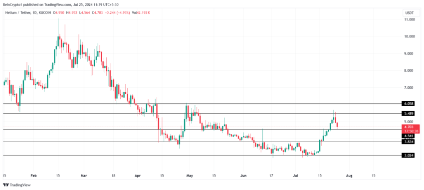 O Helium sofreu a maior queda de todas as altcoins, caindo 10% nas últimas 24 horas. Isso resultou na perda de suporte em US$ 5,0 após não conseguir ultrapassar US$ 5,5.