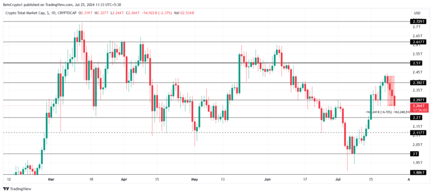 O valor total de mercado de criptomoedas (TOTALCAP) está sofrendo um grande golpe hoje, já que o mercado reagiu mal ao lançamento do ETF de Ethereum à vista. Entre as altcoins, o Helium (HNT) emergiu como o maior perdedor do dia.
