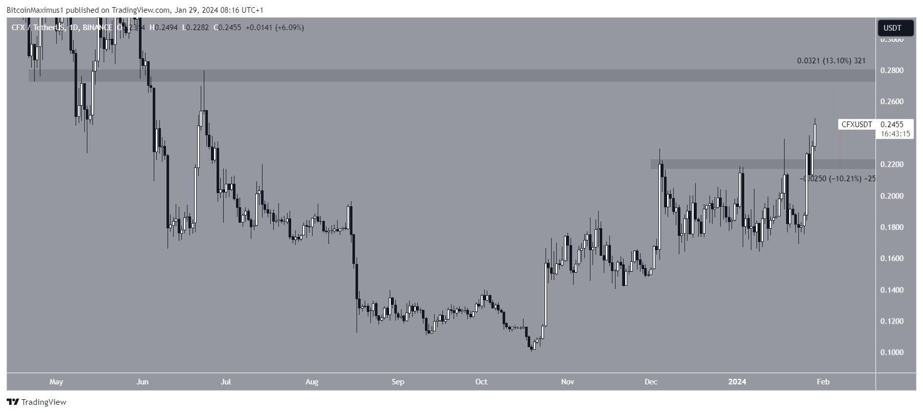 Se o CFX continuar a subir, poderá atingir a próxima resistência em US$ 0,28, um movimento de 13% em relação ao preço atual.