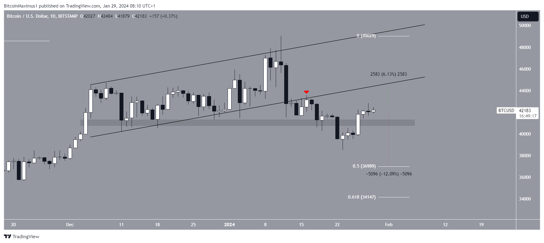 Assim como o TOTALCAP, o Bitcoin foi negociado dentro de um canal paralelo de alta desde dezembro de 2023. Isso levou a uma máxima de US$ 48.969 em 11 de janeiro de 2024.
