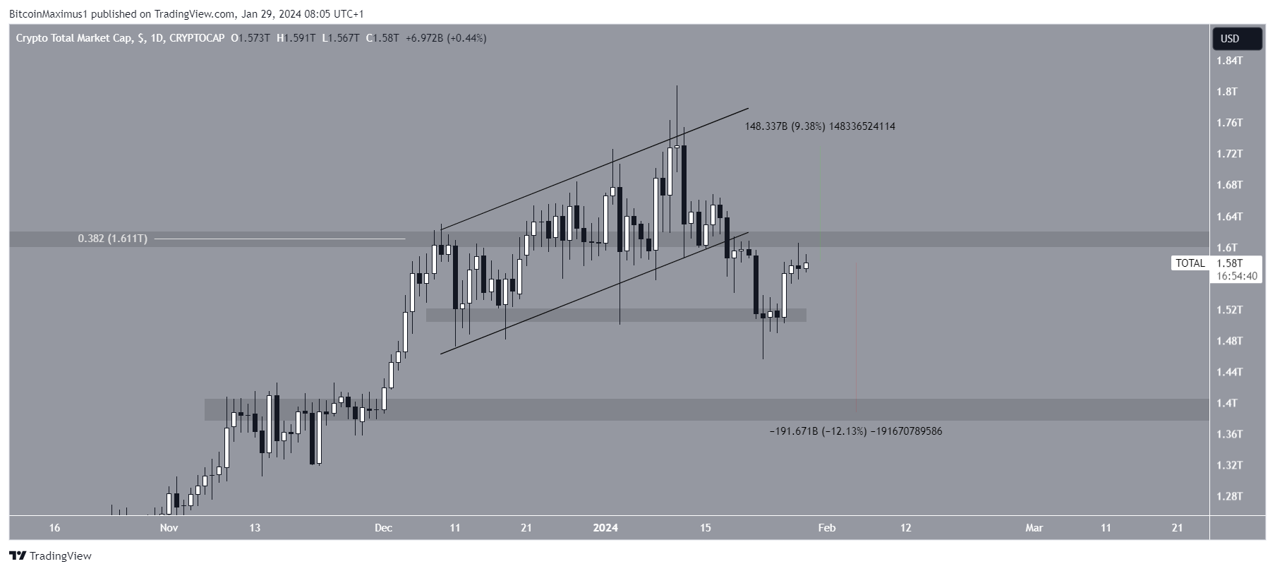 A capitalização total do mercado de criptomoedas subiu dentro de um canal paralelo de alta desde dezembro de 2023, culminando com uma maxima de US$ 1,81 trilhão em 11 de janeiro de 2024.