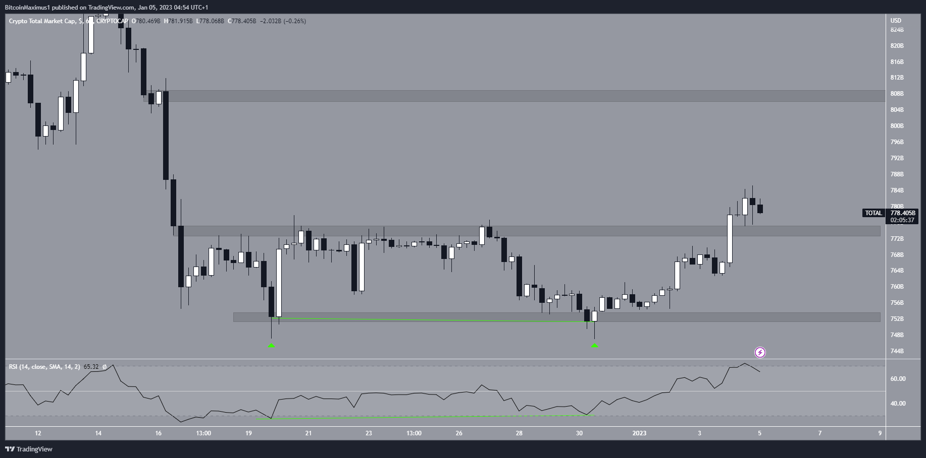 O valor total do mercado de criptomoedas criou um padrão de fundo duplo (ícones verdes) dentro da área de suporte de US$ 752 bilhões entre 18 e 30 de dezembro. O fundo duplo é considerado um padrão de alta, o que significa que leva a saltos na maioria das vezes.