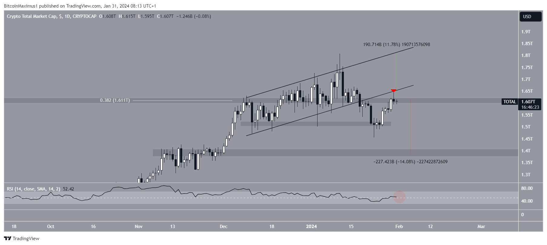 A capitalização total do mercado de criptomoedas estava dentro de um canal paralelo de alta desde 9 de dezembro de 2023. O movimento levou a uma alta de US$ 1,81 trilhão em 11 de janeiro de 2024.