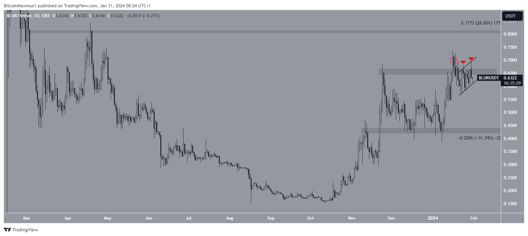 A análise técnica do gráfico diário mostra que o BLUR rompeu a área de resistência horizontal de US$ 0,65 em 16 de janeiro. No entanto, o preço não conseguiu sustentar seu movimento de alta.