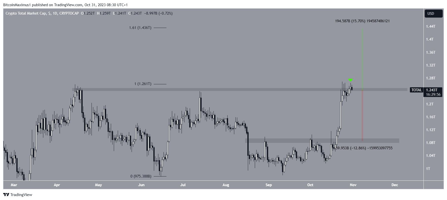 TOTALCAP estava em forte alta desde 12 de outubro. O salto levou a uma máxima anual de US$ 1,27 trilhão em 24 de outubro. O preço caiu abaixo da área de US$ 1,25 trilhão depois, a validando como resistência.
