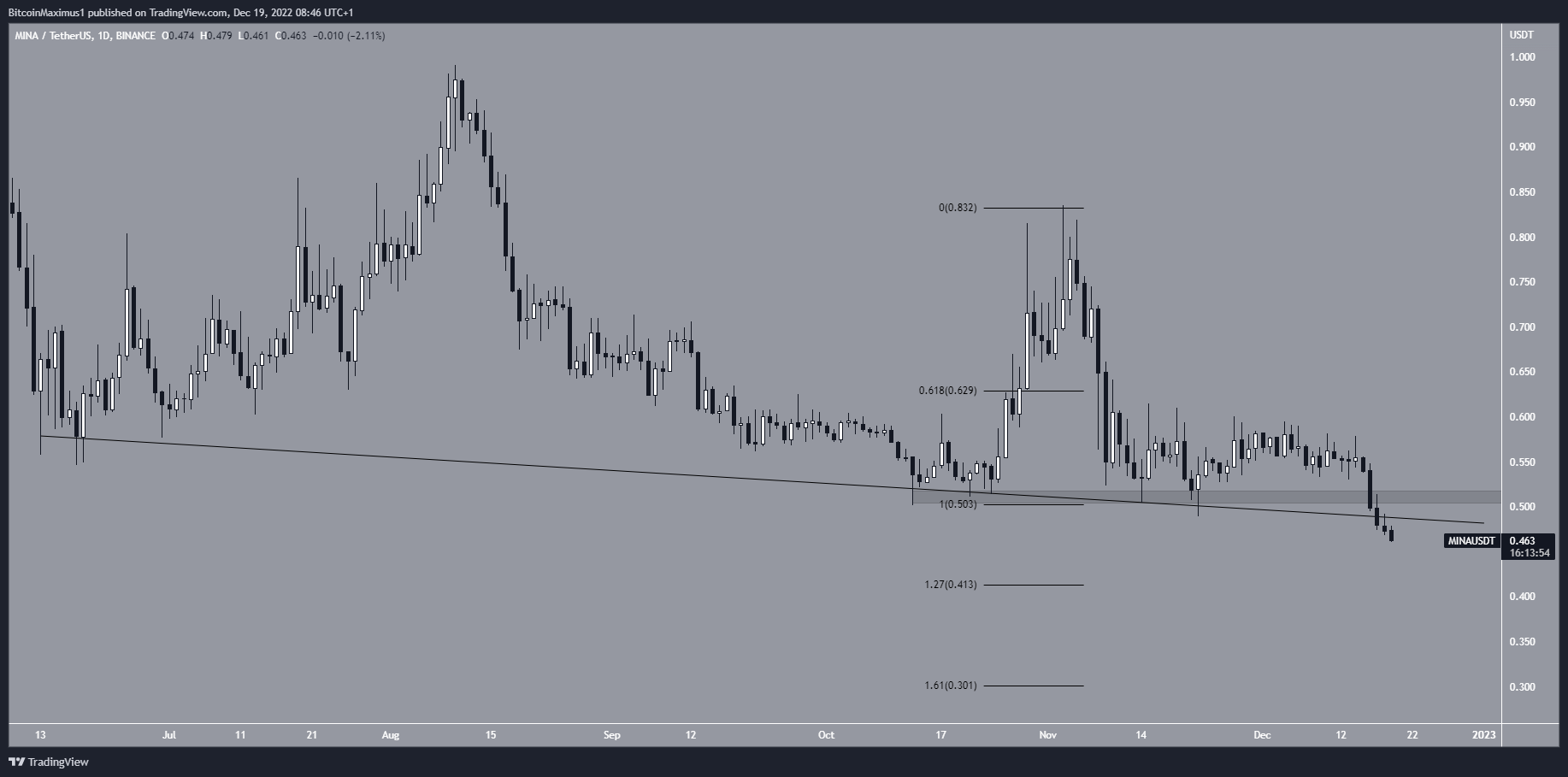 O preço da MINA estava seguindo uma linha de tendência de baixa desde o início de junho. Embora essa linha tenha causado vários saltos, o token caiu abaixo dela no último sábado (17). Ele atingiu uma nova mínima histórica de US$ 0,461 dois dias depois.