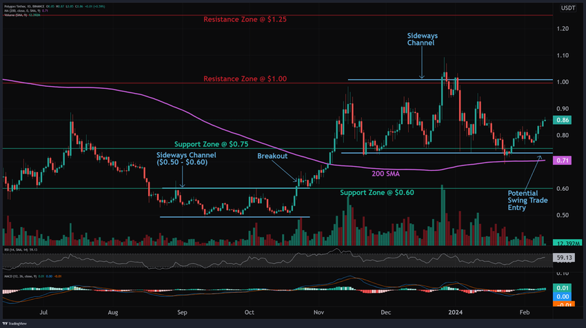 A Polygon (MATIC) demonstrou um notável aumento de preço durante a última semana, atualmente sendo negociada em torno de US$ 0,87, marcando um ganho de 10%. A capitalização de mercado atual da MATIC está aproximadamente em US$ 8,7 bilhões. Conforme destacado por uma análise conduzida pela altFINS, desde meados de novembro do ano passado, a MATIC tem mantido uma oscilação entre US$ 0,75 e US$ 1.