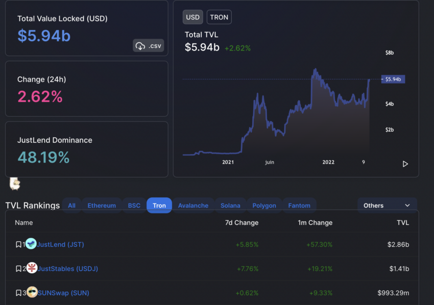 O TVL do ecossistema Tron é dividido em nove protocolos, entre os quais podemos citar: JustLend, JustStables e SUNSwap. A plataforma de empréstimos JustLend responde por 48,13% do valor total da rede. Os valores bloqueados neste protocolo aumentaram 57,30% nos últimos 30 dias, enquanto os do JustStables também aumentaram 19,21%.