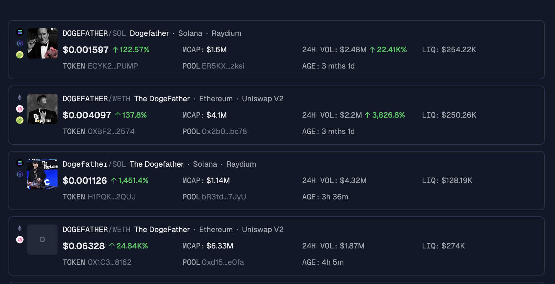 Além disso, a The DogeFather (DOGEFATHER) também subiu em três dígitos. Seu aumento de 137% elevou seu preço de negociação para US$ 0,0040. A alta não parou por aí. Vários outros tokens com temas semelhantes também viram picos de preço. Além disso, desenvolvedores oportunistas até lançaram novos tokens com o nome Dogefather que dispararam em valor dentro de horas após sua criação.