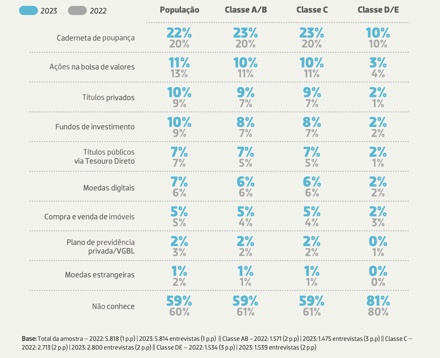 O estudo também revela um aumento no interesse por títulos privados e moedas digitais, com uma adoção crescente observada consecutivamente nos últimos anos. No entanto, o investimento em moedas digitais, como criptomoedas, tokens e outros, ocuparam o sexto lugar na lista, tendo subido apenas 1% em relação aos dados do ano anterior.