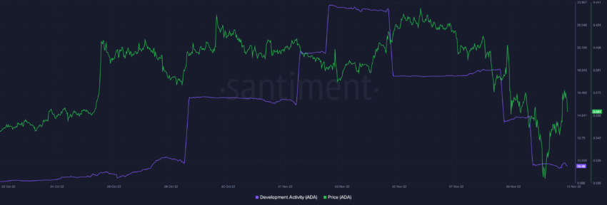 Em 2 de novembro, a atividade de desenvolvimento na rede Cardano atingiu uma nova alta local. Uma atividade significativamente maior parece ocorrer ao lado de aumentos de preços. No entanto, os dados da Sanbase mostram que a atividade de desenvolvimento agora caiu em conjunto com o preço da ADA.