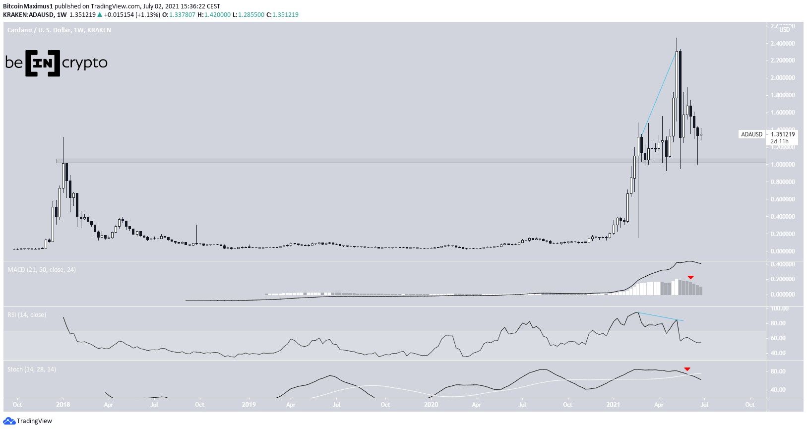 A ADA está em tendência de baixa desde 16 de maio, quando atingiu sua máxima histórica de US$ 2,46. A queda foi acentuada e levou a uma mínima de US$ 0,95 três dias depois. O movimento foi precedido por uma divergência de baixa significativa no RSI.