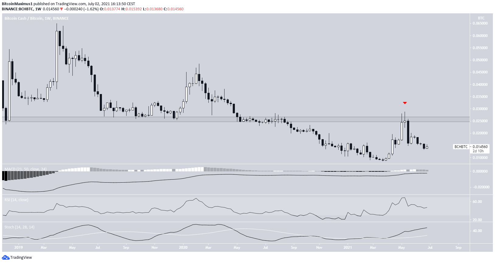Ao contrário da ADA, o par BCH/BTC parece mais baixista do que o USD. Embora o token tenha subido desde a sua mínima histórica de 0,0085 satoshis em março, o movimento que se seguiu falhou em romper a área de resistência de 0,026, que anteriormente atuava como suporte.