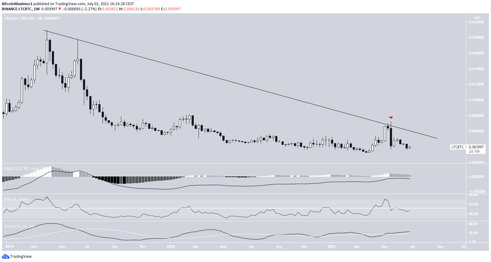 O par LTC/BTC tem seguido uma linha tendência de baixa desde abril de 2019. Mais recentemente, ele fez uma tentativa malsucedida de rompimento (ícone vermelho) em maio deste ano.
