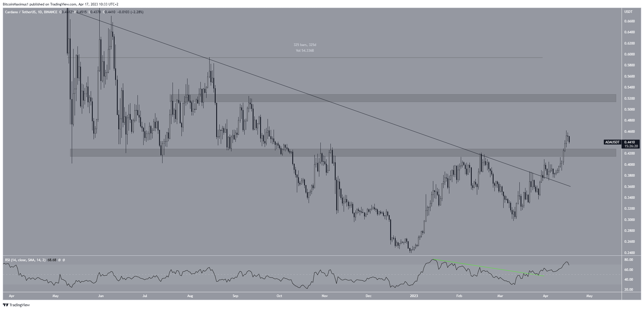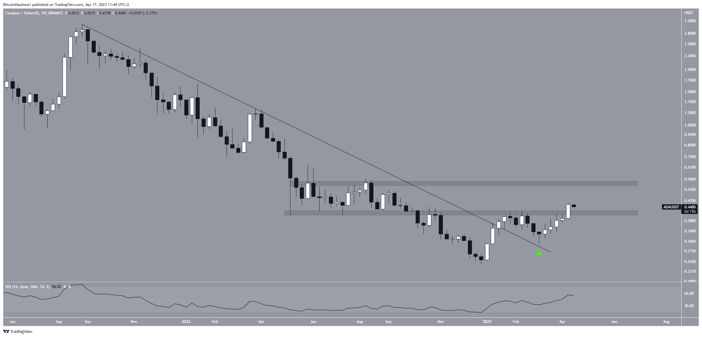 - Em primeiro lugar, o preço da Cardano (ADA) rompeu uma linha de resistência descendente de longo prazo em 30 de março. Antes do rompimento, a linha estava em vigor há 325 dias. As rupturas dessas estruturas de longo prazo geralmente levam a aumentos significativos.