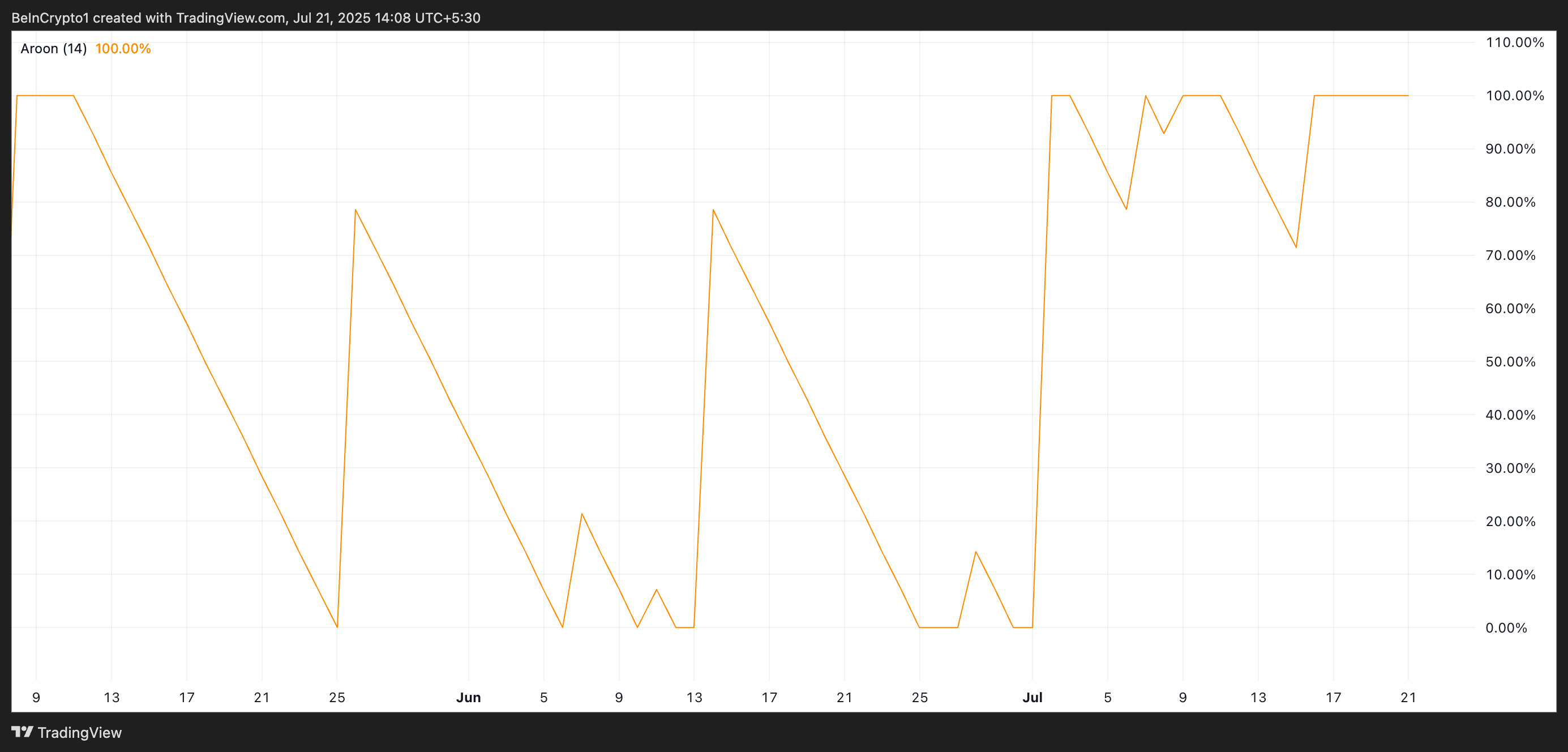 Quando a linha Aroon Up está em 100% ou próxima disso, indica que o preço tem registrado novos máximos com frequência. Isso sinaliza um forte impulso de alta. É o caso da DOGE, que voltou a um nível de preço não visto desde fevereiro.