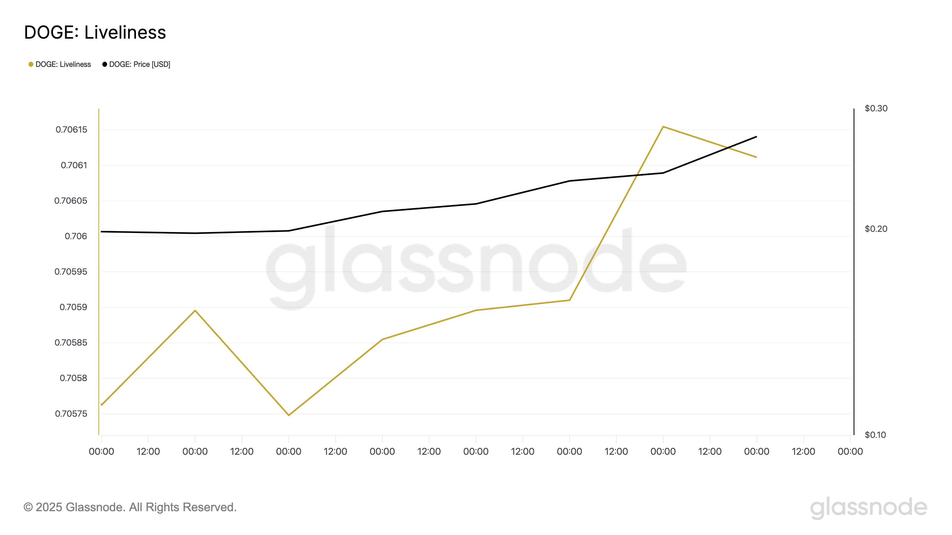 De acordo com a Glassnode, o Liveliness também cresceu em meio à alta de preço da DOGE na última semana. Fechou em 0,706 em 20 de julho, subindo 0,14% desde 13 de julho.