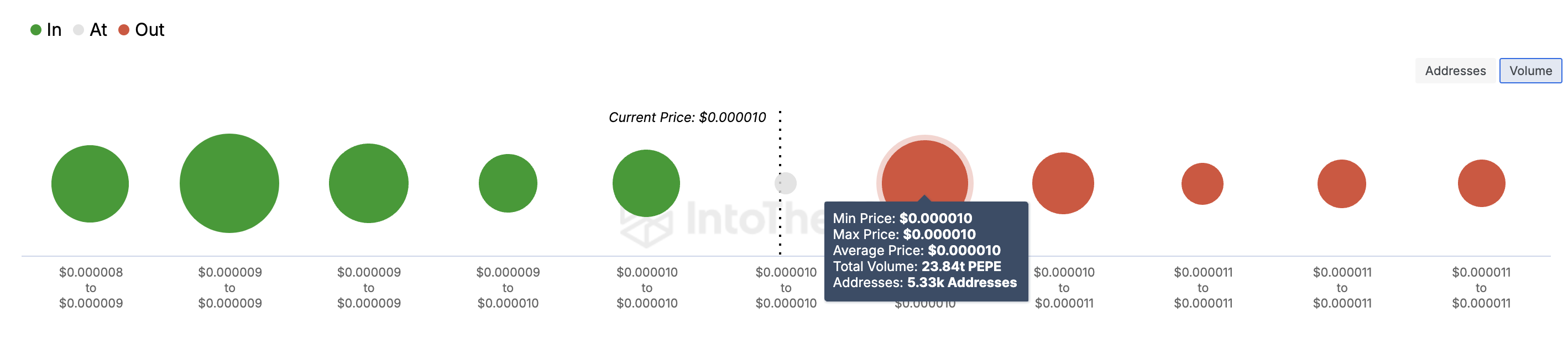 Por outro lado, quando há mais volume no dinheiro, representa uma área de suporte. No caso da Pepe, o volume a US$ 0,000010 supera muito o de US$ 0,0000090, sugerindo que o token pode ter dificuldades para ultrapassar a resistência de US$ 0,000010.