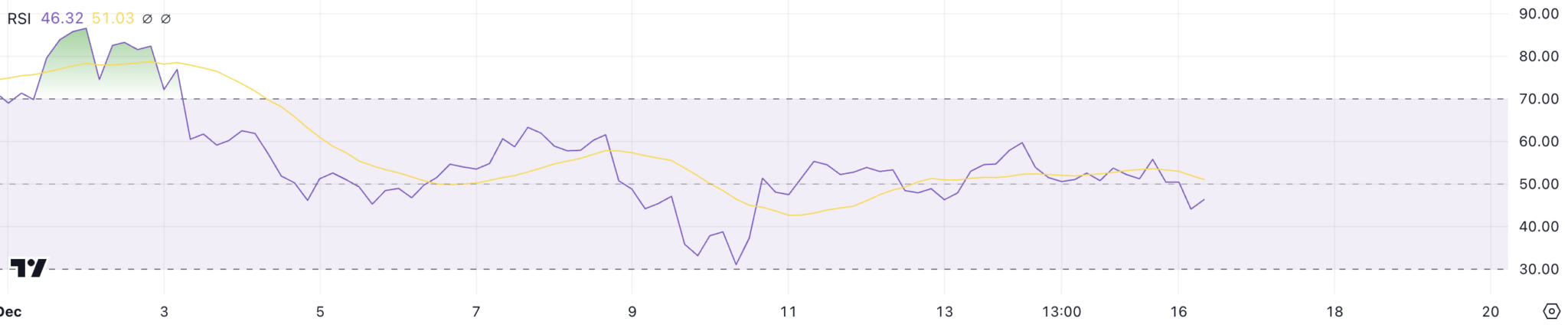 Atualmente, o XRP RSI está em 46,3, indicando momentum neutro. O RSI, um indicador técnico chave, mede a velocidade e a magnitude das mudanças de preço em uma escala de 0 a 100.