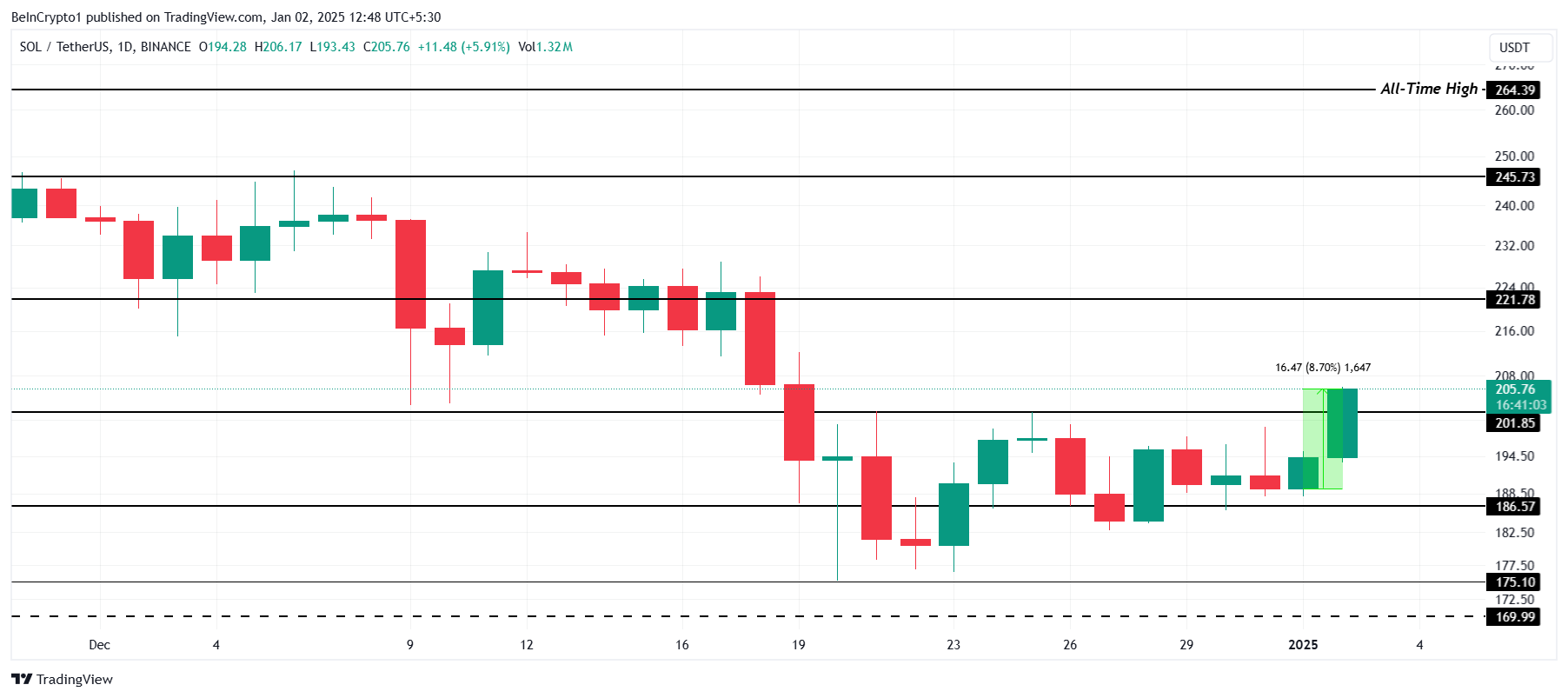 A Solana está atualmente sendo negociada a US$ 205, com alta de 8,7% em 24 horas. Esse aumento permitiu que a SOL rompesse e transformasse a resistência de US$ 201 em suporte. Manter esse nível será crucial para sustentar a recuperação em andamento e buscar novos ganhos.
