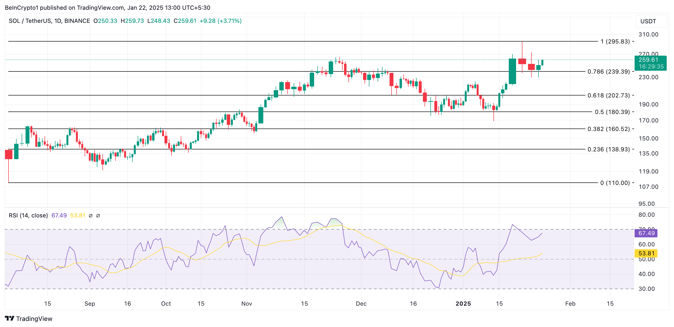 No gráfico diário, o Índice de Força Relativa (RSI) de SOL reflete a crescente demanda pela altcoin. No momento da publicação, o indicador está em tendência de alta em 67,49.