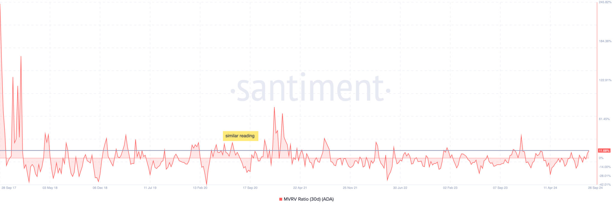 De acordo com a Santiment, a relação MVRV da Cardano está atualmente em 11,95%. Isso sugere que, embora haja alguma lucratividade, muitos investidores podem estar relutantes em vender, indicando potencialmente um sentimento de alta que poderia apoiar futuros aumentos de preço.