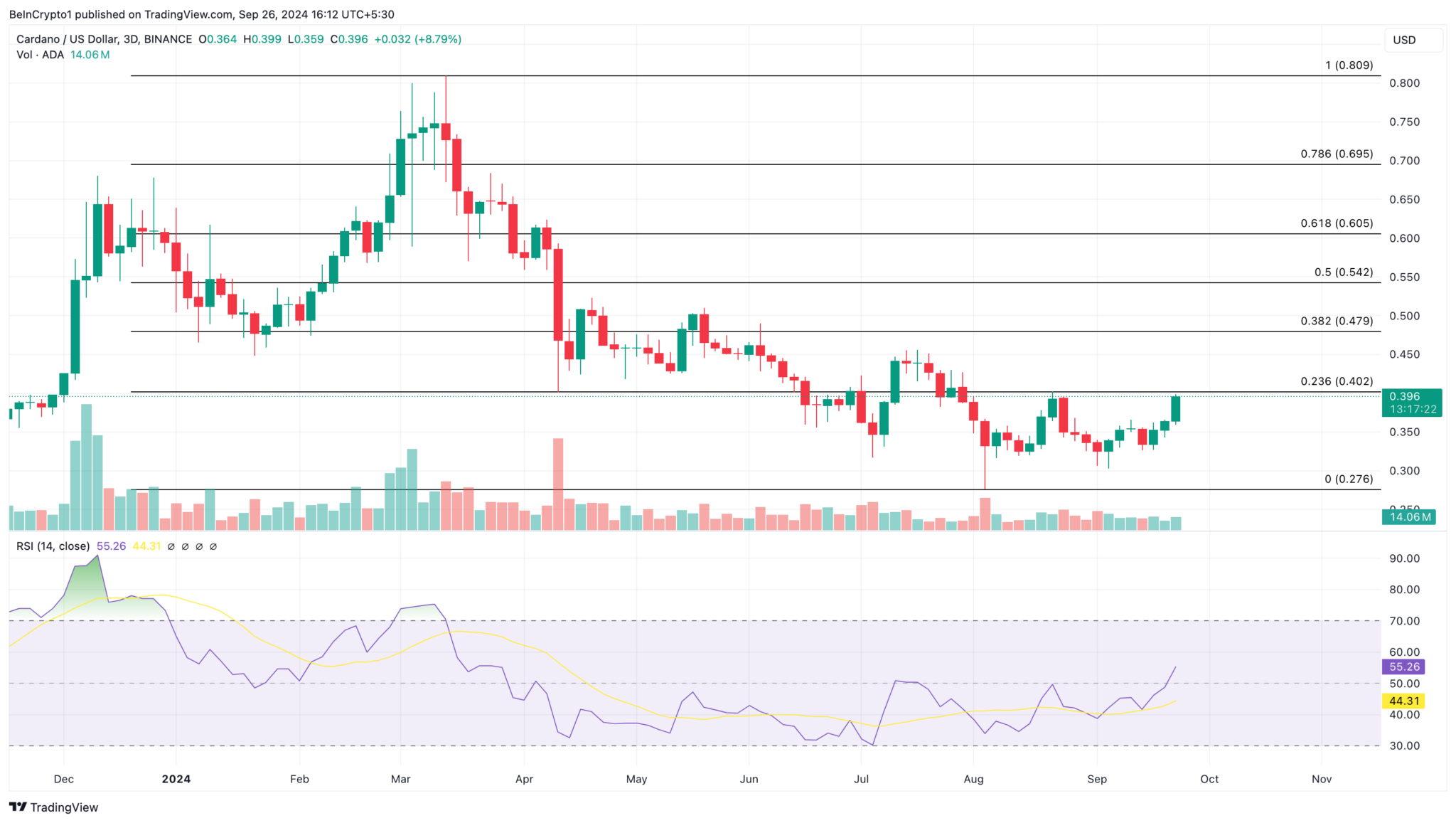 Em fevereiro de 2021, a EMA de 50 dias da ADA cruzou acima da EMA de 100 dias, sinalizando o início de seu rali substancial. Curiosamente, o preço atual de US$ 0,39 e seu alinhamento de EMA parecem espelhar a configuração antes de sua bull run anterior, sugerindo que o rompimento do triângulo de baixa pode estar no horizonte.