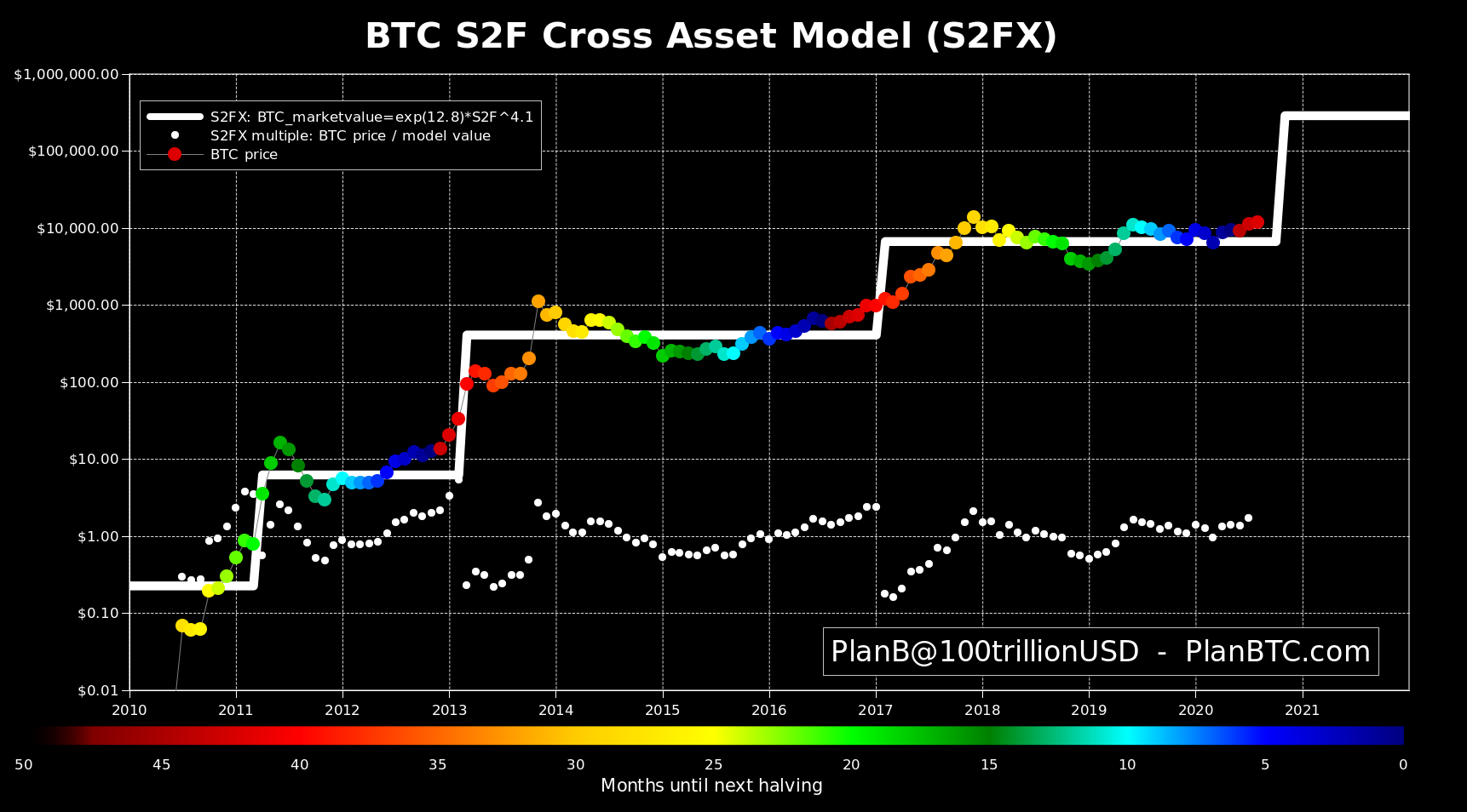 Trata-se do modelo Stock-To-Flow (S2F), que se baseia na relação entre demanda e escassez da criptomoeda. O estudo considera que os seguidos cortes na emissão a cada halving, aliado ao aumento da procura, fará o preço do BTC disparar.