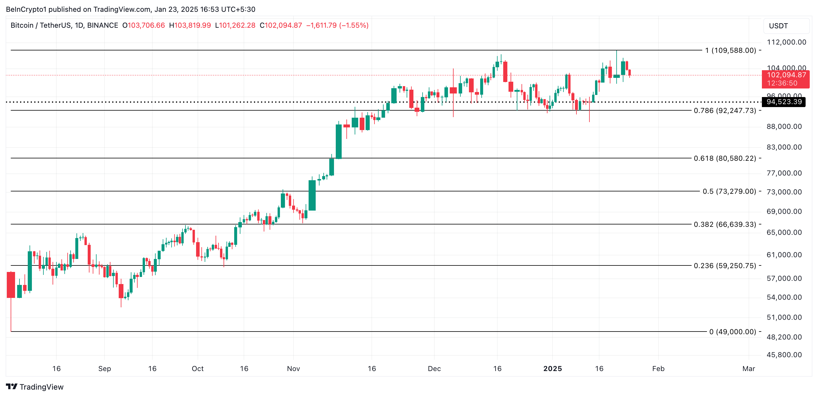 Sem a participação significativa dos pequenos traders, o mercado de BTC pode carecer do suporte necessário para manter seu impulso ascendente em direção ao seu recorde histórico. Se esses detentores de moedas continuarem a vender, o preço do BTC pode cair para US$ 94.523.