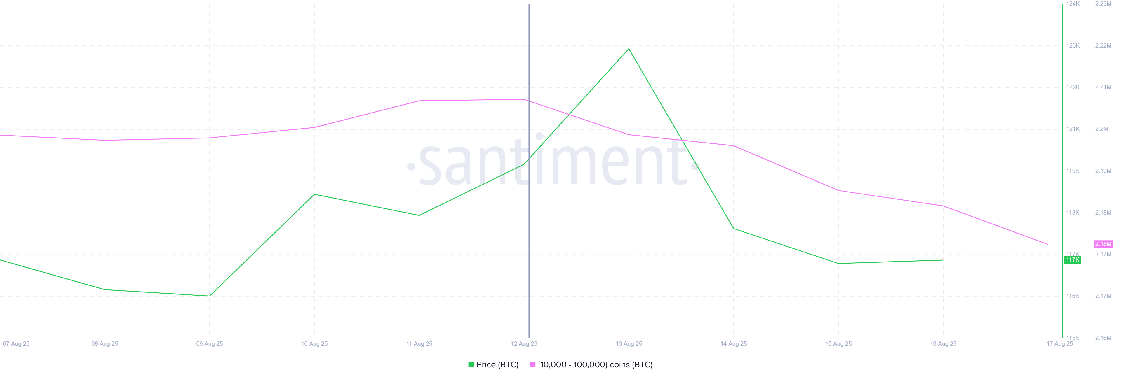 Nos últimos seis dias, baleias de Bitcoin — endereços que detêm entre 10 mil e 100 mil BTC — venderam mais de 30 mil BTC, avaliados em cerca de US$ 3,45 bilhões. Esse movimento de liquidação em larga escala indica a busca por realização de lucros após o ativo ter renovado máximas recentes.